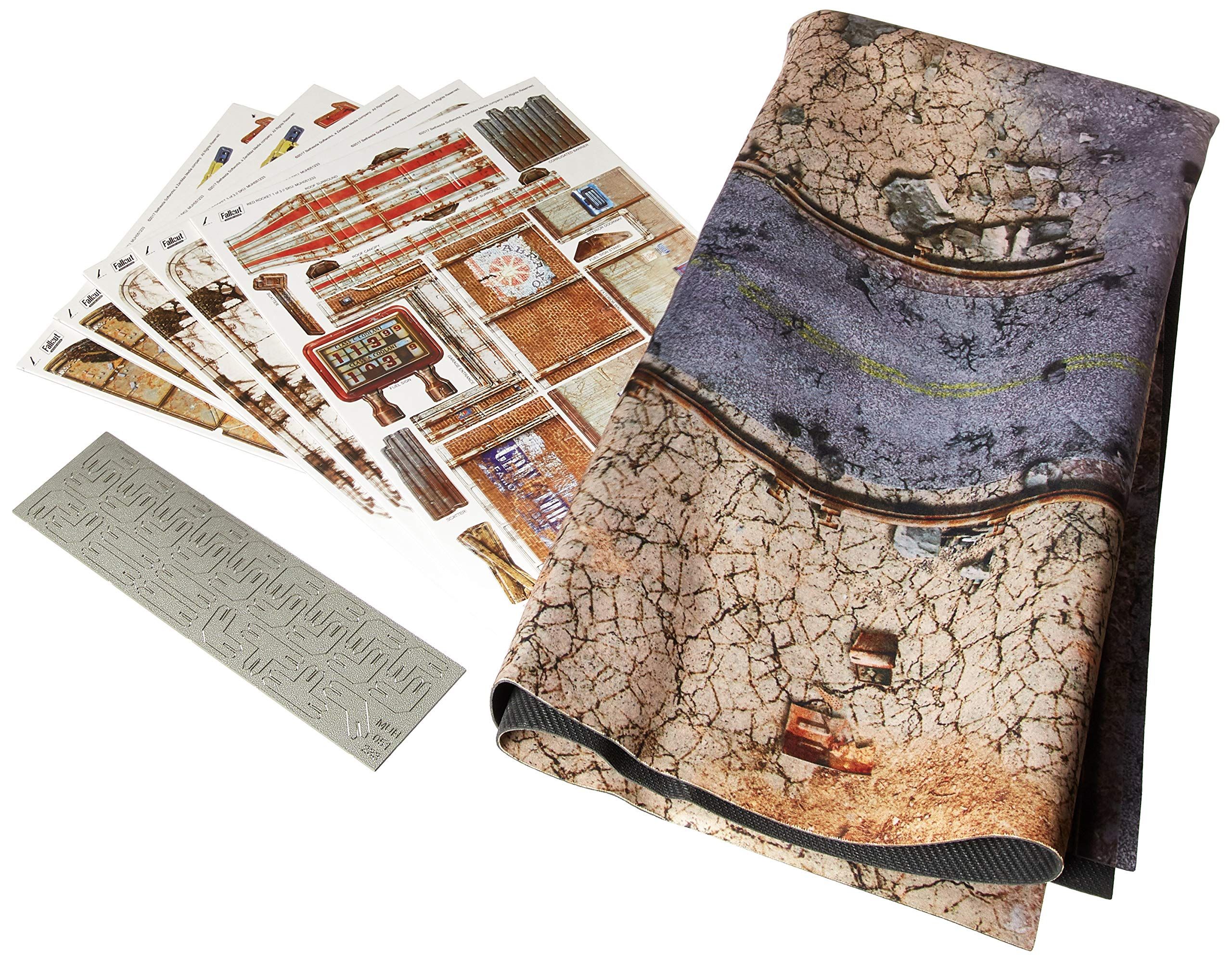 1x pre-printed clip together Red Rocket Building by Battlesystems, 1 resin Red Rocket, 2x resin Gas Pumps, 1x 3ft x 3ft neoprene wasteland gaming matt representing the area around Red Rocket and suitable for many locations.