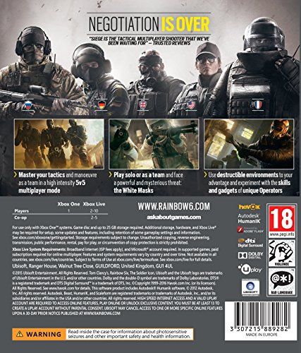Inspired by real world counter-terrorist organizations, Tom Clancys Rainbow Six Siege XBOX One puts players in the middle of lethal close-quarters confrontations. For the first time in a Tom Clancys Rainbow Six game, players will engage in sieges, a new style of assault where enemies have the means to transform their environments into modern strongholds while Rainbow Six teams lead the assault to breach the enemys position. Tom Clancys Rainbow Six Siege gives players unprecedented control over their ability to fortify their position - by reinforcing walls and floors, using barbed wire, deployable shields and mines, and more - or breach the enemies using observation drones, sheet charges, rappelling, and more. The fast pace, lethality and uniqueness of each siege sets a new bar for intense firefights, strategic gameplay and competitive gaming.